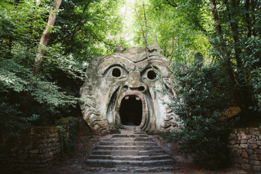 Without doubt, this is the park’s most iconic image. The Mouth of the Ogre — or Ogre Mask — is a monstrous head carved directly into the peperino, with its mouth wide open in a silent scream. Inside the mouth you can actually enter: the space is large enough to hold several people, and on the inner walls is inscribed the Latin phrase “Every thought takes flight”, which adds to the surreal and unsettling atmosphere of the place.