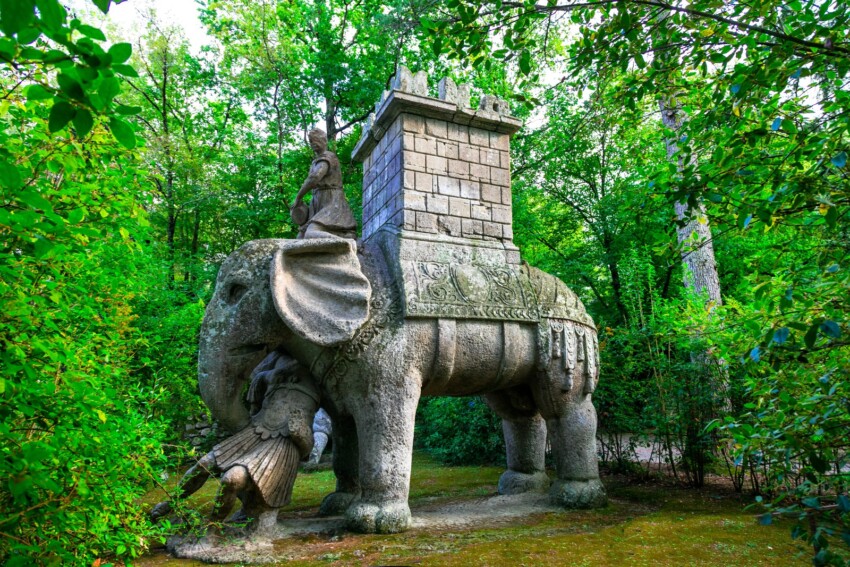 One of the most narrative sculptures in Sacro Bosco is that of the Elephant with Tower: a colossal pachyderm with a tower in the saddle carrying a Roman soldier in its coiled trunk, likely an allusion to the military exploits of the Romans who used war elephants. The work is often connected to episodes from the Punic Wars and the figure of Hannibal.