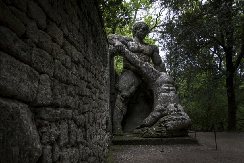 The iconography recalls Hercules killing Cacus, but also other mythological episodes linked to strength and revenge. Some scholars have interpreted the sculpture as an autobiographical reference to Pier Francesco Orsini, who may have wanted to represent his revenge against political enemies. The sense of frozen violence and the gigantism of the figure make this sculpture one of the most powerful along the entire route.