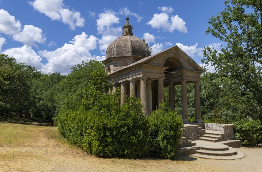 The only regularly planned building in Sacro Bosco is the Orsini Temple, a mausoleum in the form of a classical temple that Pier Francesco Orsini had built in memory of his wife Giulia Farnese, who died in 1560. The structure is relatively austere compared to the sculptural excesses of the rest of the park, and it is precisely this contrast that gives it particular emotional power.