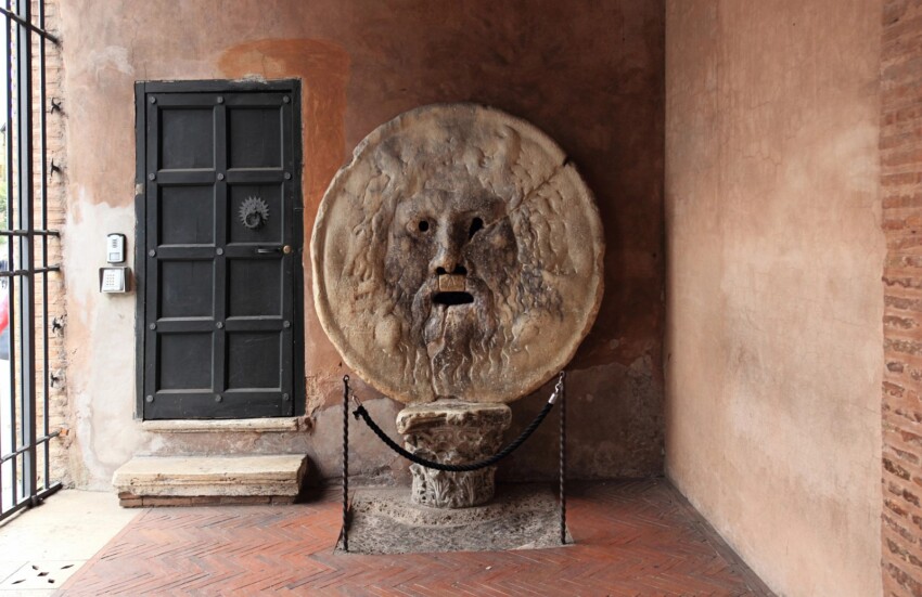 The Mouth of Truth, located in the portico of the Church of Santa Maria in Cosmedin, is one of Rome’s most iconic symbols. This ancient marble mask, dating to the 1st century AD, depicts a bearded male face with wide-open eyes, nose and mouth.