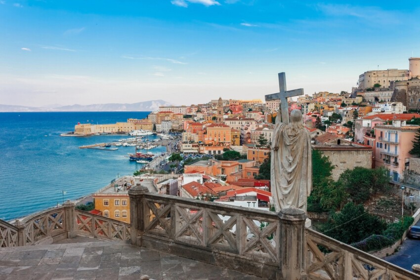 Gaeta es una de las ciudades costeras más fascinantes del Lacio meridional, a aproximadamente 140 kilómetros de Roma. Su centro histórico medieval se extiende sobre un promontorio que separa el golfo de Gaeta del golfo de Nápoles, con palacios históricos, iglesias antiguas, el Castillo Aragonés y la catedral dedicada a Sant’Erasmo. Las playas que se abren a los pies del promontorio, en particular la Playa de Serapo, se encuentran entre las más hermosas del Tirreno central, con aguas de color esmeralda y arena finísima.