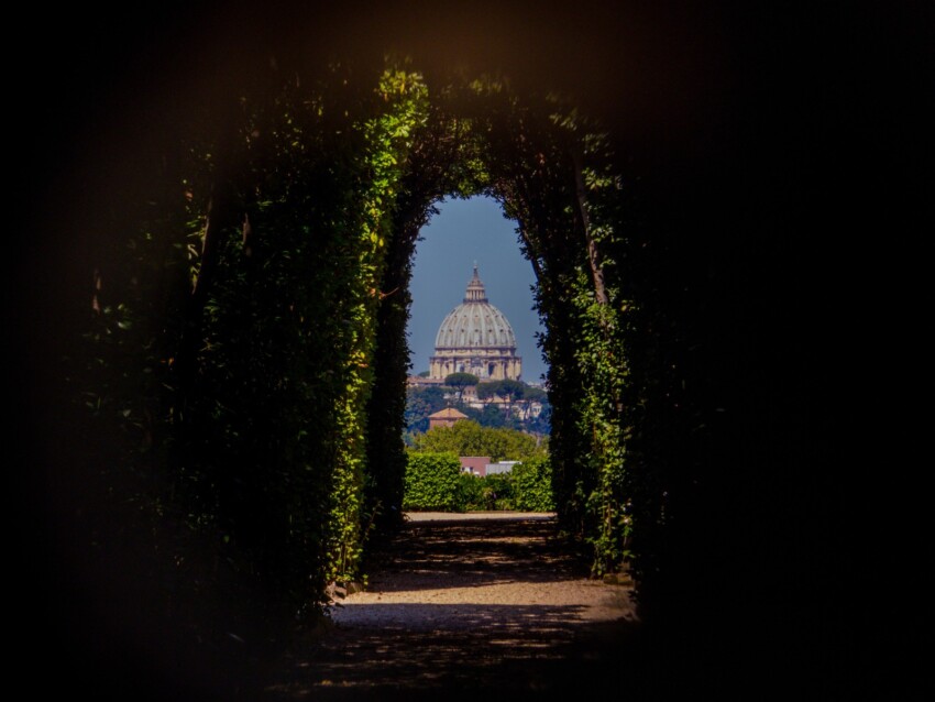 En el Colle Aventino, en la Piazza dei Cavalieri di Malta, se encuentra uno de los miradores más originales de Roma. A través del agujero de la cerradura de la puerta verde del Priorato de Malta puedes admirar un alineamiento perspectivo perfecto que enmarca la cúpula de San Pedro, encuadrada por un paseo arbolado.