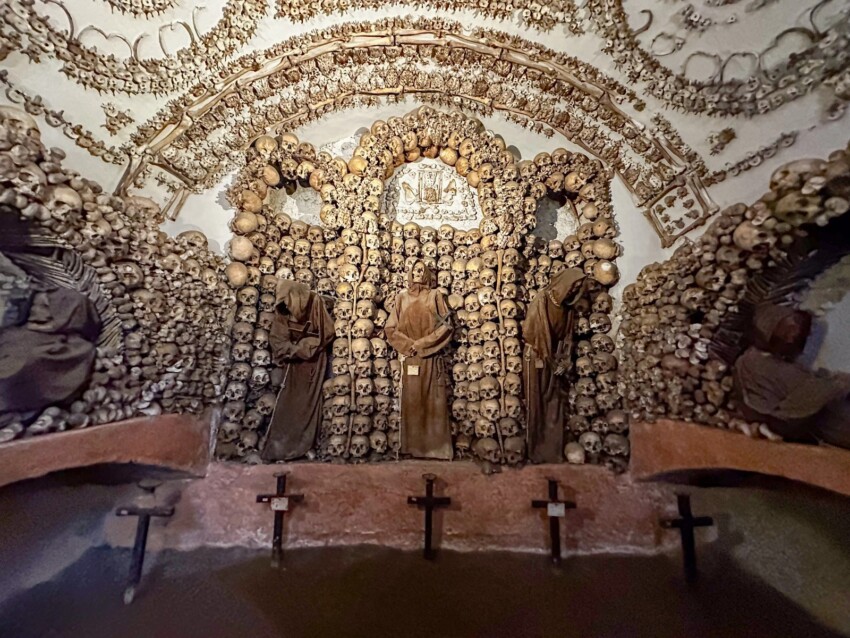 Los huesos están dispuestos en complejos motivos decorativos que transforman cráneos, fémures, vértebras y costillas en lámparas, arcos, rosetones y escudos heráldicos. Cada capilla tiene un tema diferente: la Cripta de los Cráneos, la Cripta de los Hombros y Fémures, la Cripta de las Cuencas. El efecto es simultáneamente macabro e hipnotizante, un memento mori que invita a reflexionar sobre la transitoriedad de la vida.