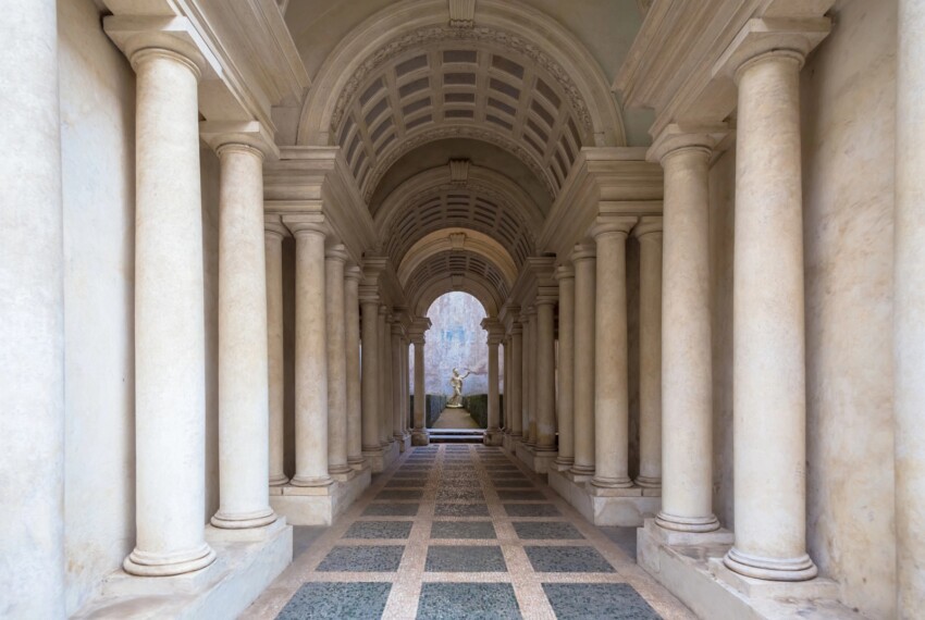 Le couloir mesure en réalité seulement 8,82 mètres, mais la perspective forcée créée par le rétrécissement progressif du sol, du plafond et des colonnes donne l’impression qu’il s’étend sur près de 40 mètres. La statue que vous voyez au fond, apparemment grandeur nature, mesure en réalité seulement 60 centimètres. L’effet est si parfait que même après l’avoir compris rationnellement, l’œil continue d’être trompé.