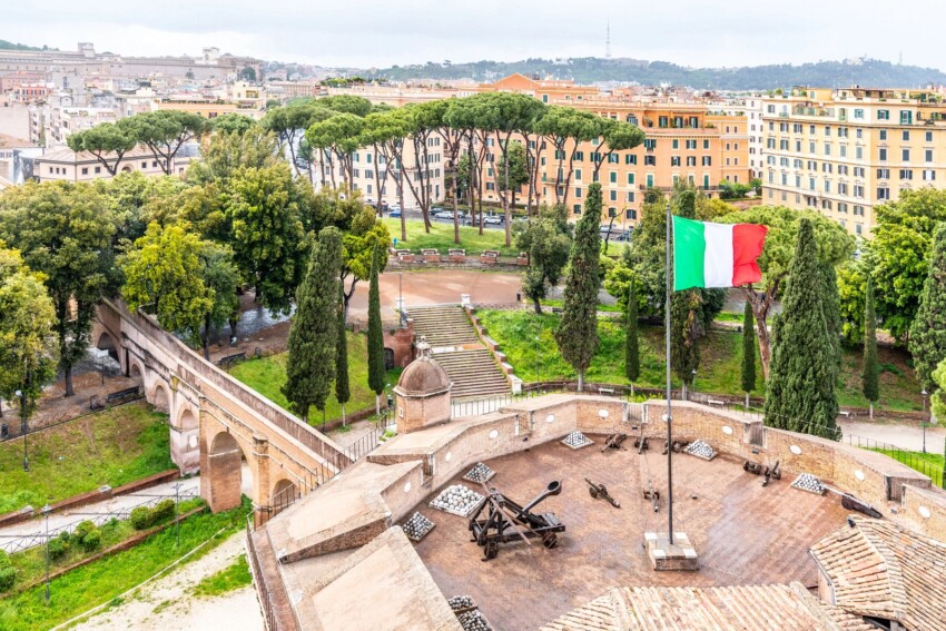 La terrasse belvédère offre une vue incomparable sur la ville : au premier plan le Tibre avec l’Île Tibérine et le quartier de Trastevere, puis les coupoles des églises romaines qui parsèment l’horizon, jusqu’à la coupole de Saint-Pierre qui domine l’horizon. Le meilleur moment pour le visiter est le coucher du soleil, lorsque la lumière crée des teintes dorées sur les toits et les coupoles.